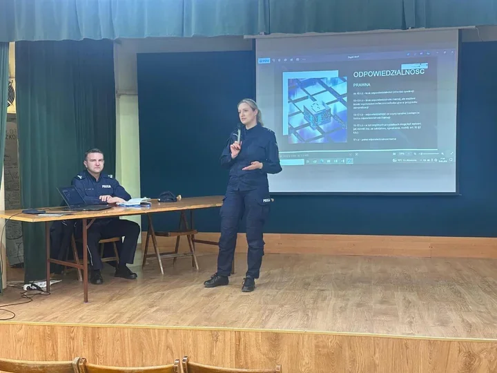 Uczniowie wysłuchali policjantów w szkolnej auli i podczas nagrania warsztatowego - rozmowy skupiły się na sztucznej inteligencji, cyberzagrożeniach i prawnych konsekwencjach zachowań młodych w sieci. Mundurowi przedstawili metody działania przestępców online i ostrzegali przed hejtem oraz odpowiedzialnością nieletnich.
