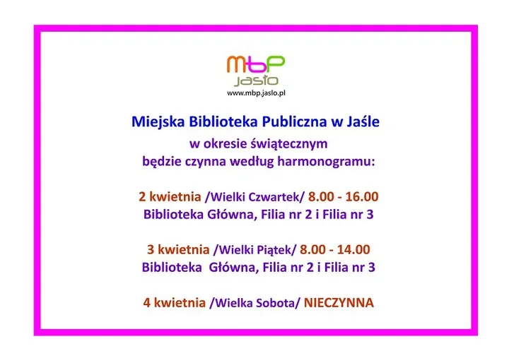 Biblioteka Główna, Filia nr 2 i Filia nr 33 kwietnia (Wielki Piątek) - 8:00-14:00